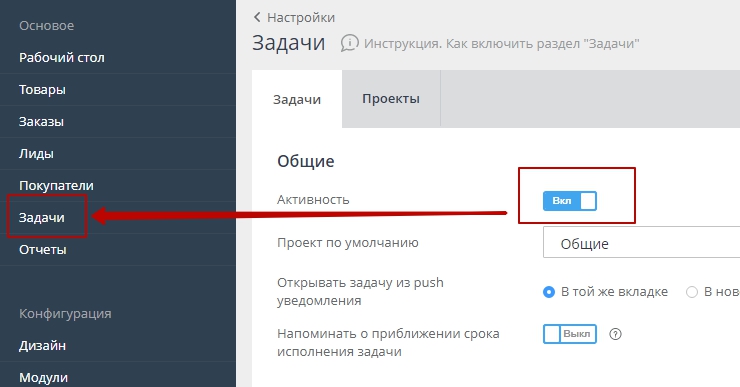 Рассмотрим как включить раздел "Задачи" и как добавить пункт "Задачи" в основное меню панели администрирования.