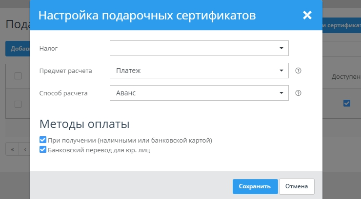 Для начала настроим методы оплаты самого сертификата, чтобы клиент мог его приобрести, далее настроим метод оплаты "Подарочным сертификатом", чтобы тот, кому подарили сертификат, мог им воспользоваться.