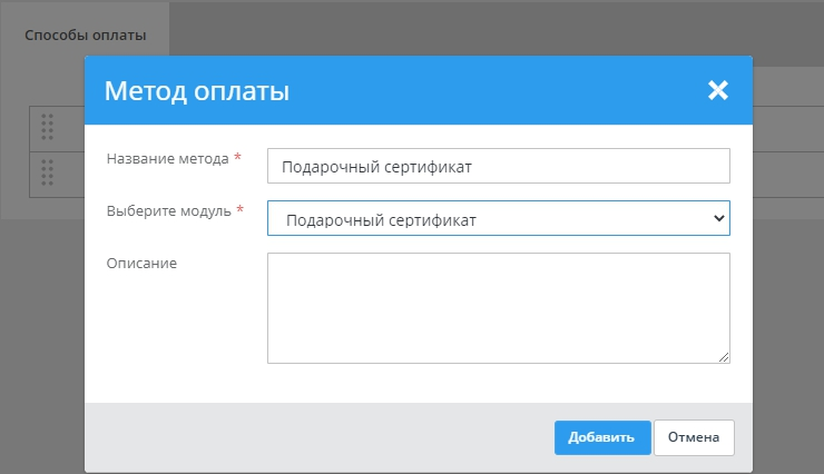 Чтобы в дальнейшем клиент смог воспользоваться сертификатом - оплатить им заказ, в настройках метода оплаты должен присутствовать метод оплаты "Подарочный сертификат". Поэтому необходимо добавить метод оплаты с типом "Подарочный сертификат" (рис. 12)